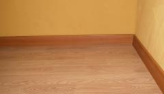하리하우스 강화마루 시공 후에 톰행크스 목수님이 데코몰딩으로 걸레받이 시공을 하였다. 걸레받이는 건축물의 최종 마감작업으로 기능적인 측면 보다는 장식적인 요소가 많이 작용하는 시공이다. 천장이 향목루바로 시공되고 벽면은 황토 핸디코트로 시공된 하리하우스 방은 바닥재로 강화마루를 시공하였다. 천장 몰딩은 전형적인 면접이 몰딩(크라운 몰딩 또는 베벨 몰딩)으로 시공하였고 바닥면도 같은 재질의 호두나무색 데코몰딩재로 걸레받이 시공을 하였다. 하리하우스 천장과 창문 몰딩재의 색상은 자단색으로 시공하고 바닥 걸레받이는 호도나무 색상으로 시공되어 세 개의 서로 다른 건축재가 혼재된 하리하우스 내부 마감재의 특성을 살리는 몰딩으로 시공되었다.