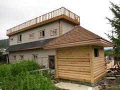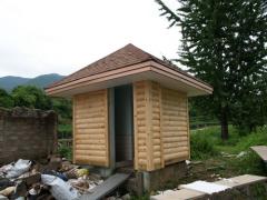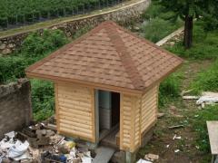 리모델링 중인 하리하우스 재래식화장실 리모델링 공사가 끝나가고 있다. 기존의 벽돌쌓기와 미장으로 마감되고 슬라이브 옥상의 구조를 가지고 있던 재래식화장실을 구조목과 OSB합판으로 지붕을 만들고 아스팔트슁글 시공으로 마무리하고 외벽에는 로그사이딩을 시공하였다. 기존에 있는 소변과 대변의 칸막이 구조는 그대로 두고 외관의 변화만으로 하리하우스 본채와 조화되는 귀엽고 예쁜 화장실로 새롭게 태어났다. 화장실은 사용상의 청결도 중요하지만 쾌적한 환경을 만들어 주는 것도 중요하다. 비록 재래식 화장실이 하리하우스의 메인 화장실은 아니지만 가장 환경친화적인 화장실로서의 가치와 실외에서 활동시 사용상의 편의를 위하여 재래식화장실을 목수들이 아름다운 화장실로 만들었다. 앞으로 화장실 내부의 일부 타일시공과 함께 카우보이 문을 시공하는 작업이 남아 있다.