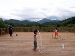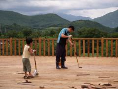 단양의 명산들이 보여주는 대자연의 파노라마가 펼쳐졌다. 그 싱그러운 날에 지윤이 아빠는 데크 바닥에 오일스테인 칠하는 작업을 하고 지승이 엄마는 보일러실 공사 중에 더럽혀진 문 앞 데크를 물청소 하였다. 지윤이도 하고 싶다고 그래서 팬티만 남기고 벗겨 주었더니 철솔로 데크 바닥에 이물질을 제거하는 일을 재미있게 하였다. 하리하우스는 그렇게 깨끗해지고 튼튼해지고 있었다. 집은 사람의 손길이 지나간 만큼 건실해진다. 아무리 좋은 집이라도 집주인이 무관심한 집은 서서히 문제를 일으킨다. 그래서 부지런한 사람의 집이 좀 더 오랜 세월 동안 사람과 함께하는 복을 누릴 수 있다. 그런 측면에서