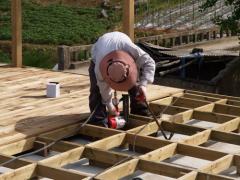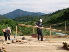 [사진]방부목 판재를 바닥 장선(STUD)에 고정하여 망치질 하는 강목수님