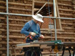 [사진]귀틀집 공사현장에서 원형톱 작업대를 설치하는 톰행크스 목수