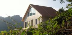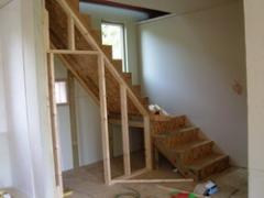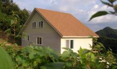 샌드위치판넬을 이용한 벽체와 C형강으로 골조를 세우는 전형적인 주택이 학운산방이다. 샌드위치판넬을 이용한 조립식주택 건축 초기에 부실시공 탓과 화재에 대한 취약성만을 내세우는 방송화면 덕분에 그 동안 샌드위치판넬을 이용한 조립식주택에는 많은 오해와 편견이 있었다. 싸구려 집이라는 이미지와 함께 불타는 샌드위치판넬을 떠올리며 아직도 많은 사람들이 샌드위치판넬을 이용한 집짓기에 오해와 편견이 있는 것도 사실이다. 하지만 요즘 건축되는 샌드위치판넬 공법의 조립식주택은 결코 값싼 건축재도 아니고 부실한 건축공사의 대표선수도 아니다. 조립식 주택도 내외장재의 선택에 따라 건축비가 하늘과 땅 차이만큼 크게 차이나고 샌드위치판넬의 장점인 시공 상의 장점을 고려하면 21세기에 아직은 가장 경쟁력 있는 주택건축 중에 하나이고 전국적으로 골고루 샌드위치판넬을 이용한 주택이나 공장과 창고가 건축되고 있다. 샌드위치판넬이 가지고 있는 장점 중에 단열성은 가격대비 효율성에서는 그 어떤 건축재도 따라 올 수 없는 장점이 있다. 잘만 시공하면 고급스런 외장과 시원하고 따뜻한 집을 그래도 가장 저렴하게 지을 수 있는 주택이 샌드위치판넬을 이용한 주택건축이다. 오랜 시간동안 주택건설 현장에서 검증되고 입증된 최선의 선택으로 시공되는 학운산방이 요즘 막바지 작업에 한창이다. 현관 앞 방부목을 이용한 데크와 다락방 내부의 루바 시공이 진행 중이고 화장실과 주방의 타일공사가 끝났다.