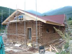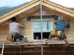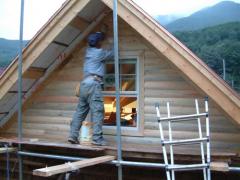 정선군 남면 자미원 은빛마을에 짓고 있는 귀틀집 로그사이딩(Log Siding)을 했다. 벽체가 낙엽송 통나무로 쌓아 올려지고 아스팔트슁글로 박공지붕을 덮은 후 벽체의 통나무 소재와 어울리는 로그사이딩으로 박공지붕머리의 합각벽(合閣壁)을 시공하였다. 회장님 목수와 막둥이 목수가 호흡을 마치고 티처 목수와 톰행크스 목수가 짝을 이루어 작업을 진행했다. 로그사이딩은 판재 형태의 사이딩 보다 좀 더 자연스럽고 입체감이 있는 통나무의 느낌을 주는 친환경건축재이다. 로그사이딩 후 소나무색 오일스테인으로 도장 할 예정이다.