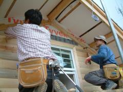 [사진]로그사이딩 시공 중인 (좌)티처 목수님과 톰행크스 목수님