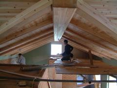 [사진]귀틀집 거실 천장 루바로 대들보와 서까래 공사 중인 목수