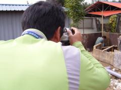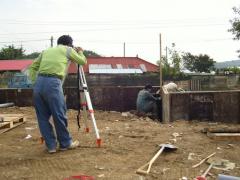 [사진]조립식주택 기초콘크리트 타설을 위한 거푸집에 레벨기로 수평선 작업