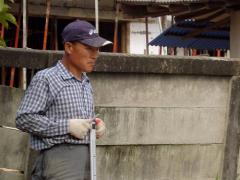 영원한 회장님 목수님이다. 조립식 주택의 형강 기둥을 세우기 위하여 기준점을 정하고 높이를 맞추는 작업 중이다. 폴대를 붙들고 있는 가지런한 모습에서 오랜 건축현장에서 살아온 연륜을 느낄 수 있다. 회장님 목수라는 것도 박석주 목수님의 현장 닉네임이다.