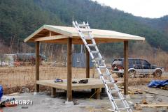 건축다큐21 성주 전원주택 숲속의 하우스 정자 지붕골조 공사가 마무리 단계에 접어 들었다. 지붕처마널에 원바이에잇(1x8) 시다판재로 마감을 하고 동후레싱과 슁글시공 후 난간대 설치를 할 계획이다. 참고로 정자 뒷편에 서 있는 튼튼한 무쏘는 건축주 아버님의 애마 입니다 ^__^