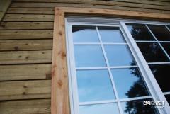 단양 전원주택 온돌형 방갈로의 방부채널사이딩과 중앙고정식 양쪽열림 로이코팅 보스톤시스템 창호이다. 트림은 원바이포 시더이다. 보스톤시스템창호는 단열과 방풍 방음에 대하여 가격대비 효율이 좋은 창호이다.