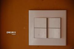 단양 전원주택 온돌형 방갈로 내부 벽체의 황토핸디코트 미장과 4구스위치입니다. 스위치는 윗쪽에서 시계방향으로 방조명, 외부 데크벽부등, 현관등, 전면 벽부등으로 설치되었습니다. 4구 스위치는 한 곳에서 여러 조명을 제어 할 수 있는 장점이 있지만 각 조명별 스위치 찾기가 익숙하기 전까지 복잡하다는게 단점입니다.