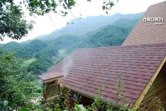 저 멀리 단양의 명산 금수산이 병풍처럼 펼쳐진 학강산 중턱에 들어선 전원주택 본채 황금색 이중그림자 슁글과 황토방의 박공지붕 흑적색 이중그림자 슁글지붕이다. 가마솥이 걸린 부엌 아궁이에 불을 지펴서 연소시험 중이다. 황토방 평사각 굴뚝 지붕에도 흑적색 슁글이 시공되었다. 아스팔트슁글은 경제성과 시공이 용이하고 방수성능이 좋은 지붕재이다. 그러나 시공이 부실하면 바람에 취약한 측면이 있다. 바람이 센 곳에는 슁글시멘트로 보강해주는 것이 필요하다.