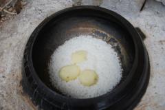 불을 지핀지 10분쯤 되면 가마솥이 눈물을 흘리기 시작한다. 솥안에 있는 밥물이 끓어서 나오는 순간부터 쌀이익어 밥으로 되어간다. 불을 지핀후 모든 것이 30분안에 해결된다. 물론 아궁이에서 불이 잘타야 한다는 가정에서 하는 말이다. 30분쯤 있으면 밥은 다 되었다고 판단되어 뜸들이기를 10분 하였다.