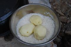 온돌 방갈로 부엌 아궁이에 가마솥을 걸고 기념으로 가마솥밥을 지었다. 준비된 감자와 쌀은 3인분인데 가마솥밥은 양이 많을 수록 밥짓기가 편하다. 작은 가마솥인데도 불구하고 쌀이 너무 적은 것 같다는 느낌이 든다. 그래도 명색이 가마솥인데 10인분은 해야 될 것 같다^^. 전기밥솥과 압력밥솥의 밥물양이 다르듯이 가마솥도 다르다. 평소보다 10%많이 넣었는데 물양이 약간 적은 것 같았다. 20%은 되어야 될 듯하다.
