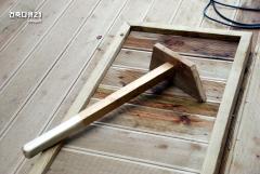 방부목 데크(deck)의 상판과 부동수전 박스 그리고 온돌구들 부엌 아궁이에서 재를 긁어내기 위한 고무래이다. 고무래도 방부목으로 제작했다. 온돌구들 방갈로 시공현장에서 쓰고 남은 자투리목으로 생활도구를 제작했다. 부엌 아궁이 깊이와 적당히 맞게 고무래 자루와 날을 만들었다. 방부목으로 제작하여 물에도 강한 특성이 있어 오래오래 사용 할 수 있을 것이다.
