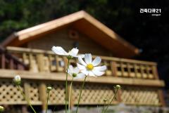 흰색 코스모스꽃과 온돌구들 목조주택 방갈로 - 건축다큐21