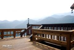 전원주택 방부목데크이다. 5년전에 시공된 데크와 올해 시공된 데크가 서로 만나서 또 하나의 데크(deck)가 만들어졌다. 새로만든 데크는 투명오일스테인을 칠하고 전에 만든 데크는 도토리색 오일스테인이 도색된 상태이다. 사진 오른쪽 상단의 현관지붕에 메달링 풍경의 물고기가 움직이지 않고 있는 것 같지만 셔터가 눌러지던 그 순간에도 바람이 엄청 불었다. 구름사이로 뿜어져 나온 가을 햇살이 단양의 명산(名山) 금수산을 감싸고 있어 고요하고 따스한 느낌의 풍경이지만 실제 현장은 세찬 바람에 쌀쌀한 날씨였다.