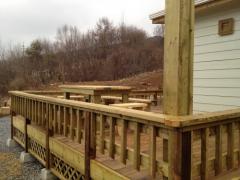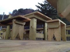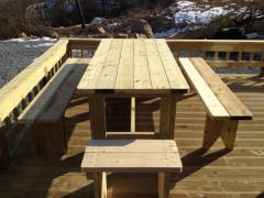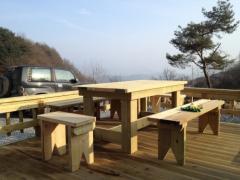 단양 소형목조주택 방갈로 데크(DECK)에 투바이포와 식스 방부목으로 8인용 야외테이블을 제작했다. 테이블에 다리가 고정된 일반적인 피크닉테이블은 일상에서 이용하기에 불편한 구조이다. 상리 방갈로의 야외테이블은 의자가 분리되어 실제 이용시 실용적인 구조로 제작되었다. 의자 일부에는 방부목이 없어서 구조목으로 대체하였다^^.