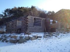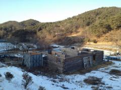 제천 통나무집 지붕공사 현장의 설경이다. 아주 오래전에 인류가 맨 처음에 살았던 집은 동굴이다. 그러다가 강가에서 고기잡으며 갈대로 집을 짓다가 좀 더 멋진생각을 가진 사람들이 나무를 잘라 벽체를 만들고 살아왔던 형식으로 짓고있는 집이 제천 통나무집이다. 귀틀집의 형식이지만 벽체에 흙을 나무사이에 쌓아 넣지않고 통나무를 가공하여 벽체를 쌓는 집이다. 건축주 가족이 정성들여 쌓아놓은 통나무집 벽체에 건축다큐21에서 지붕을 만드는 현장이다.